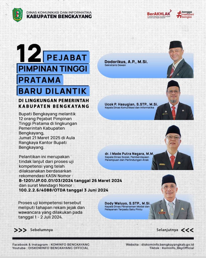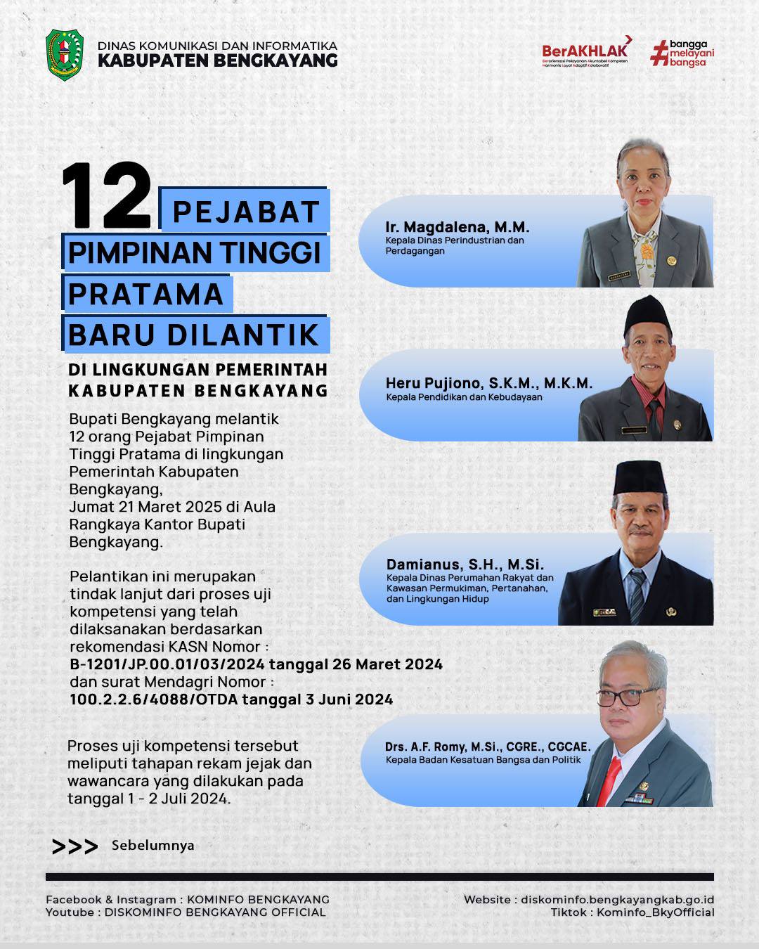 Sobatkom Bengkayang!The Regent of Bengkayang, Sebastianus Darwis, S.E., M.M., has inaugurated 12 new High-Ranking Officials within the Bengkayang Government on Friday, March 21, 2025, at the Rangkaya Hall, Bengkayang Regent Office.